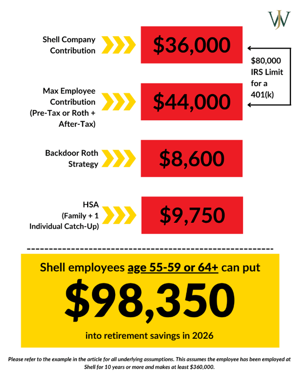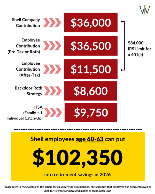 For super-savers at Shell, this change provides a valuable opportunity for older employees to enhance their retirement savings as they approach retirement. Employees in this 4-year age bracket maxing out their Shell Provident Fund, a family HSA with catch-ups, and backdoor Roths can save up to $102,350 in 2026!