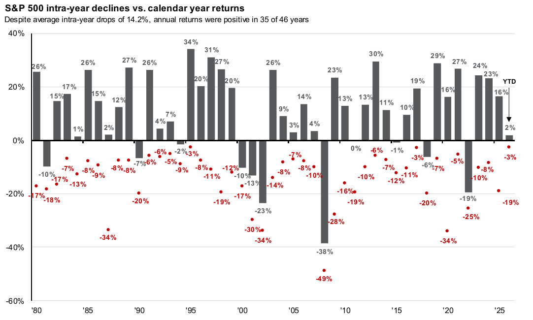 Returns are based on price index only and do not include dividends. Intra-year drops refers to the largest peak-to-trough decline during year. Returns shown are calendar year returns from 1980 to 2025, over which the average annual return was 10.7%. Past performance is no guarantee of future results.