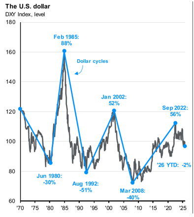 One of the most important developments of 2025 was a change in market leadership. International equities outperformed U.S. stocks, returning approximately 32% compared to 17.8% for the S&P 500. A key contributor to this shift was a weaker U.S. dollar, which began declining after remaining largely flat from late 2022 through much of 2024, providing a meaningful tailwind to international returns.