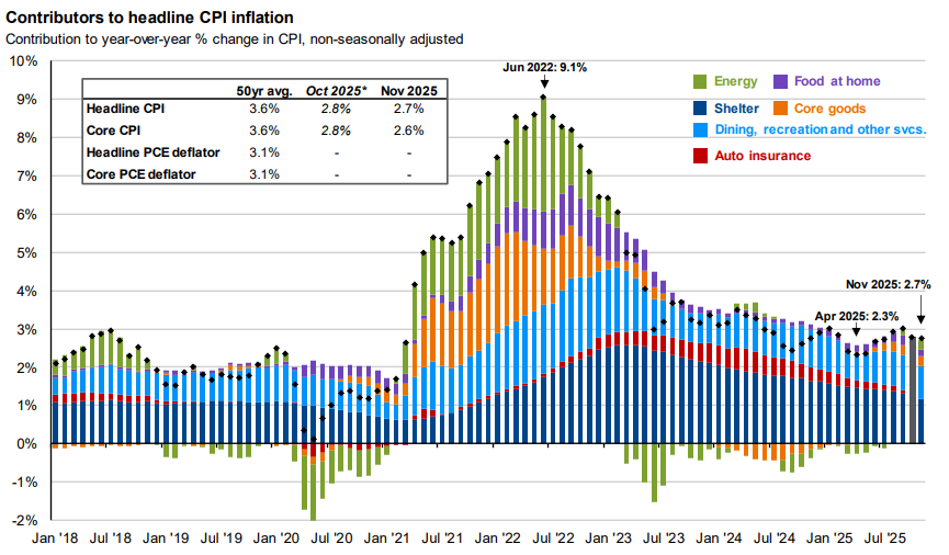 Contributions mirror the BLS methodology on Table 7 of the CPI report. Values may not sum to headline CPI figures due to rounding and underlying calculations. “Shelter” includes owners’ equivalent rent, rent of primary residence, and home insurance. “Food at home” includes alcoholic beverages. Headline and core PCE deflator inflation shown are based on seasonally adjusted data due to data availability. *Official October 2025 data unavailable due to government shutdown, and data shown are J.P. Morgan Asset Management estimates.