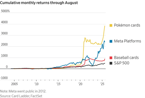 Still, it’s important to remember that not every asset with rising prices represents a sound investment. Over the past two decades, even high-value baseball and Pokémon cards have outpaced the S&P 500 in total return, but that does not mean they are a reliable long-term investment. The lesson is that it’s easy to let fear of missing out( FOMO) take over when something is “running.” Staying grounded in fundamentals matters far more than chasing short-term excitement.
